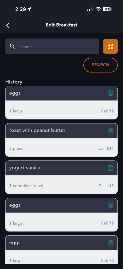 7) You will be taken back to the History page. Here, you can add more items or head back to the main Nutrition tab by tapping “Back” or on the Nutrition tab.